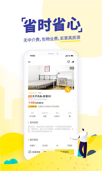 通过手机App自主选房,预约看房,在线签约,提交订单与支付完成整个流程。满足18到35岁范围内年轻人的租住需求。
