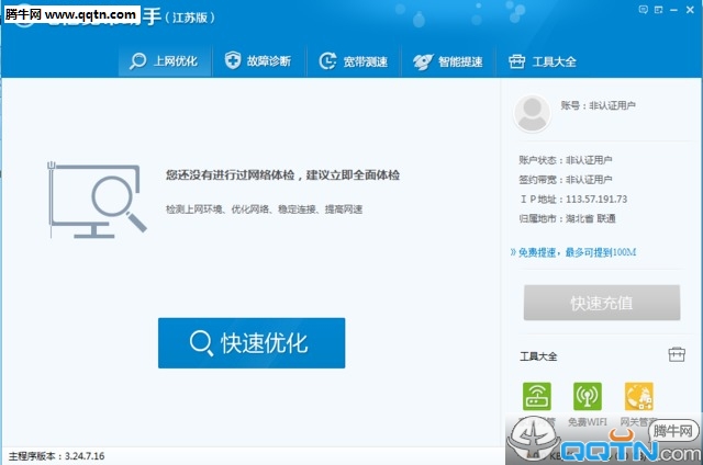 江苏电信宽带助手提供了诊断、优化、测速、提速等功能,是江苏地区电信宽带用户必备网络优化功能,还能修复上网故障,海淘加速等。