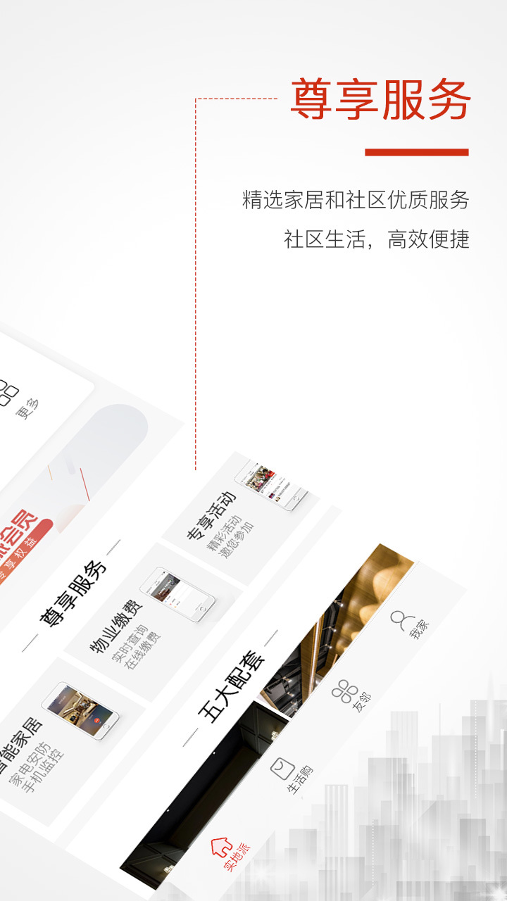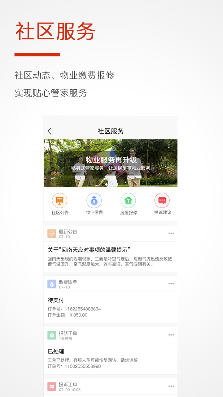 1. 社区服务:获取小区公告,快速报修、建议,拉近业主与物业之间的距离,实现贴心管家服务。