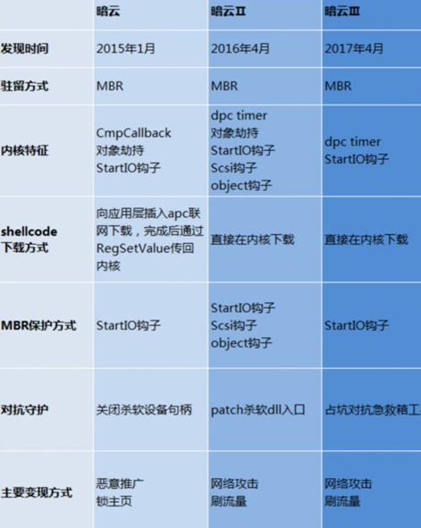由于该木马主要通过挂钩磁盘驱动器的SttIO来实现隐藏和保护病毒MBR,而此类钩子位于内核很底层,不同类型、品牌的硬盘所需要的hook点不一样,且“暗云Ⅲ”增加了更多判断代码,能够感染市面上的绝大多数硬盘;此外,“暗云Ⅲ”对安全厂商的“急救箱”类工具做专门对抗,通过设备名占坑的方式试图阻止某些工具的加载运行。