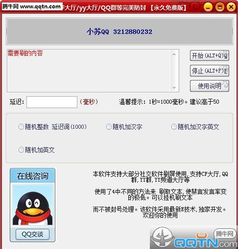 小苏刷屏器是一款专业的刷屏工具。完美支持cf游戏大厅、QQ和YY,还能在各种游戏中刷票聊天,输入想要刷的文本,设置时间,就可以无限刷屏。操作方便,绿色安全。有需要的可以来本站下载使用。