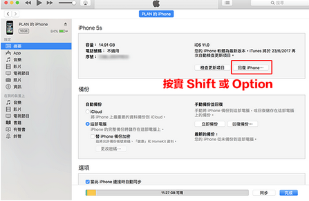 确保iTunes 更新到最新版,连接iPhone 到Mac/PC,待侦测到iPhone 之按左上方的手机按钮,来到手机界面,按实Shift 键(Windows)或Option 键(Mac)按按「回复iPhone 」,就会弹出视窗要求用户选择ipsw 档案。