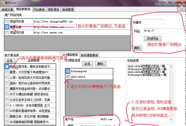 二.博客群自动更新功能。对你的网易博客群自动更新新闻,并在新闻中添加你要的网站链接,并且所有博客进行循环链接。