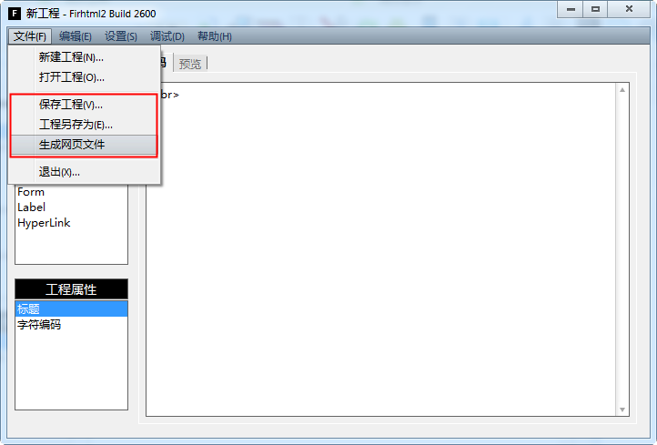 4、编辑完成的html代码可以保存为工程文件,也可以直接生成网页文件
