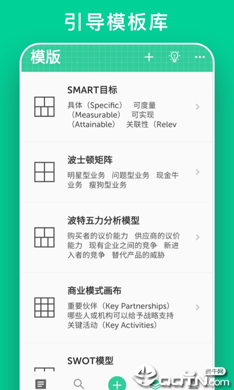 你可以通过 App 中收录的大量模板来快速上手,建立结构化思维的基础概念,比如三分法笔记、时间管理四象限、SWOT模型等等。也可以自由搭建你自己独家的思考框架。