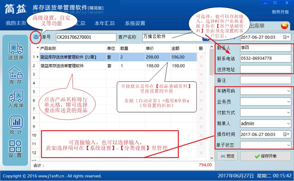 库存数量的变动是系统根据你送货单明细和入库单明细,自动统计的,每填写一个送货单,就会相应的减少库存。