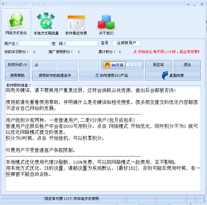 “百度关键字优化精灵”,分为本地优化和网络优化2个主要优化功能。本地优化通过代理服务器方式模拟不同机器环境来刷网站流量和排名,有很多优点不同于其他同类软件: