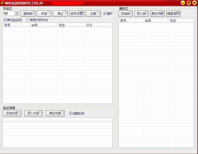 1、登录要加好友的QQ号码,或者批量导入登录QQ号(注意导入的QQ号码和密码要用----隔开)。