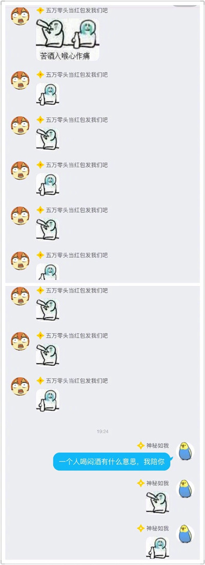 “苦酒入喉心作痛”一个mini的小表情最近被很多网友翻了出来,还有配上中日双语的“甘甜的心情突然变得苦涩”等等,这个表情包源于“当然是选择原谅她啊”绿帽系列,大概就是为了表达一下苦涩的心情,比如好基友失恋了,这个表情包他是这样用的: