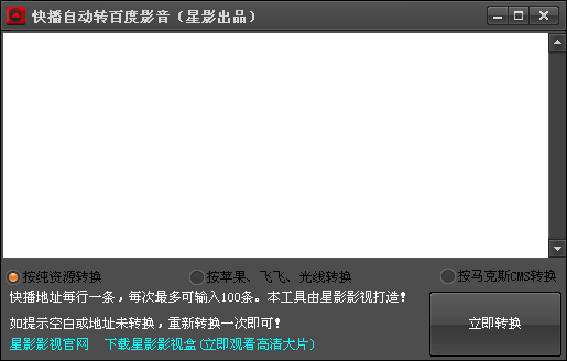 1.一次只可转换100条快播资源,多余的将自动截取!