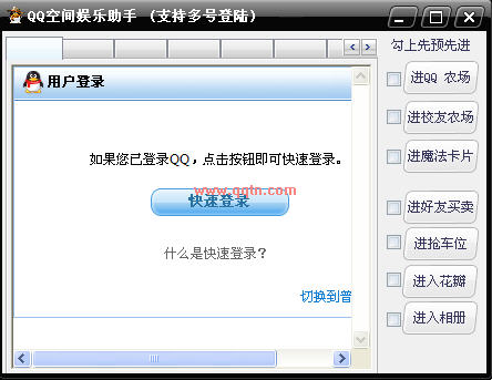 支持10QQ号登陆,自由切换,支持开通等项目功能,主要是方便爱好QQ空间的朋友,借助此工具快速度进入QQ空间的、牧场、魔法卡、好友买卖、抢车位等个系列项目,此程序非外挂,所以不用担心给封号。