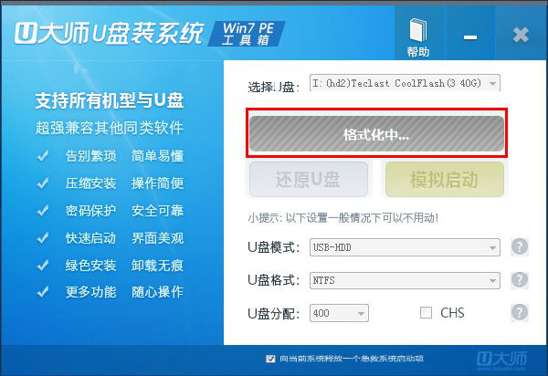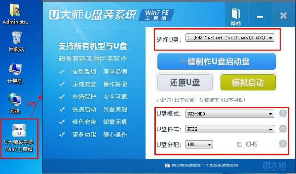 1.首先插上U盘然后双击运行电脑桌面上“U大师装系统Win7工具箱”的图标,该工具能够自动识别出插入电脑USB接口的所有USB设备,请选择要制作成启动U盘的盘符,然后可以根据个人情况,分别设置启动模式和系统格式,如图: