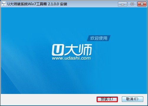 1.双击上步中下载好的U大师U盘装系统Win7的安装文件“udashi_Win7_2.1.exe”,运行安装程序。2.单击界面上的“安装”按钮,开始工具的安装,如图: