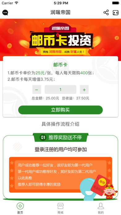 润珮帝国APP是一款集邮币卡投资,增值,全国大跳排,金币,积分兑换,红包即领即提,同时融合三级分销商城为一体的三网合一金融性商城平台,用户一次投资,终身增值。