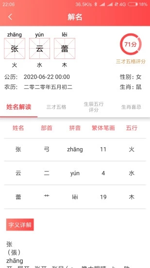 4.【八字起名】 根据宝宝生辰八字,推算宝宝的五行强弱,喜用五行,判断名字的五行与生辰的匹配度。