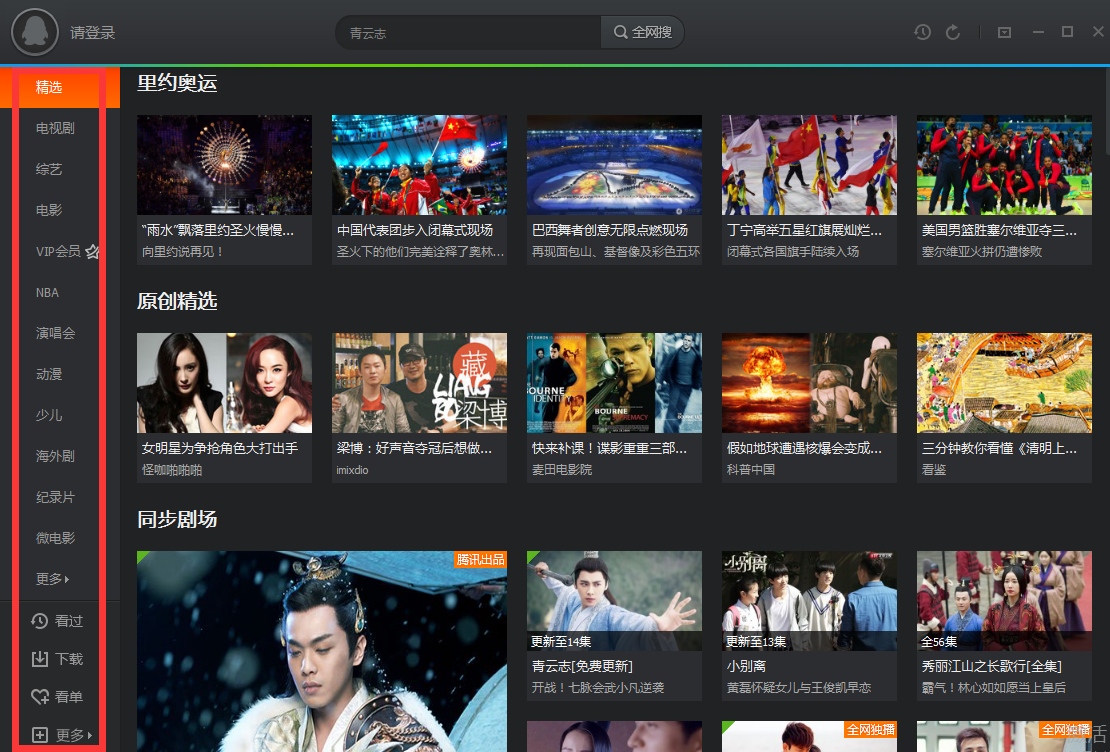 腾讯视频播放器的视频库页面中,提供海量高清的电影、电视剧、综艺、动漫等等视频。打开腾讯视频播放器,推荐首页就有很多点播节目,而且为了用户更方便查找,点播视频都按照内容的分类分栏目列出,以下红色框内的内容都可以即点即看。