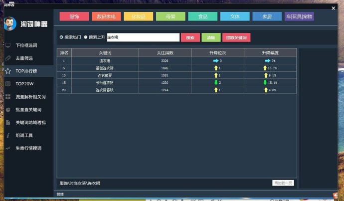 1、TOP排行榜:可查询所有类目的关键词排行榜。