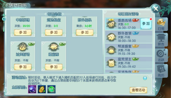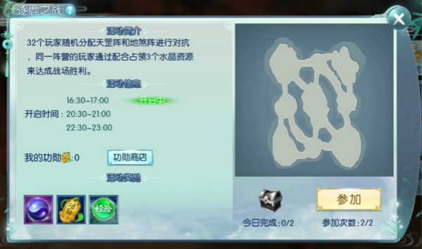 活动只能单人进行参加,每场32个玩家随机分配到天罡阵和地煞阵进行对抗,战场中双方玩家都可以累计同一种资源点数,先达到达到胜利条件即可获胜,本次战场结束。玩家可以主动退出战场,但主动退出后无法获得任何奖励。