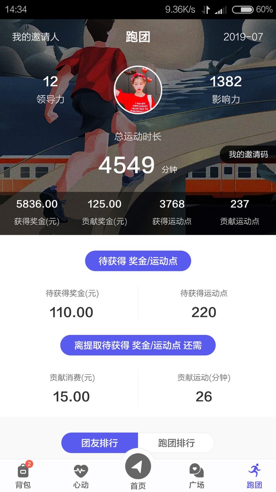 用户可以参加跑团,跑团和商家合作,帮助商家,用户就可以获得分成奖励,运动健身和赚钱两不误!