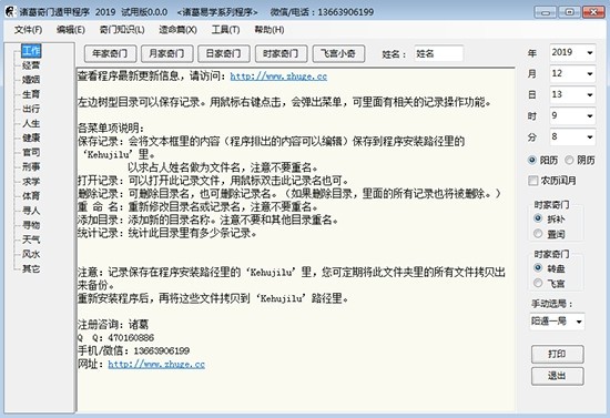 程序有“时家奇门”、“日家奇门”、“月家奇门”、“年家奇门”和“飞宫小奇门”五种起局方法。其中时家奇门排局采用两种方法:拆补法和置闰法,用户可根据自己的习惯选用,也可比较两种方法在使用中的准确率孰高孰低。“时家奇门”又有“转盘法”和“飞宫法”两种排法,“飞宫法”里还有“六壬金口诀”起课内容。本程序对“时家奇门”每一局都有详细解释,有八宫解释和以下二十五个事项:总断、兵事、出行、阳宅、阴宅、附占胜败、虚实、、守城、天时、地理、人事、田禾、家宅、官禄、应试、求财、婚姻、胎产、疾病、捕获、失物、远信、鸦鸣、鹊噪等(采用《御定奇门宝鉴》内容)。另外本程序还有大量的奇门遁甲基础知识,供大家学习参考。