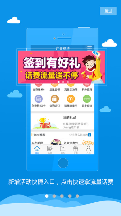 4、优惠活动:每月签到、摇摇乐,话费流量等福利特惠尽在掌握