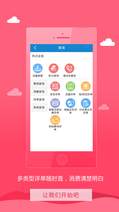 1、秒查业务:流量、话费、余额、积分、消费账单等随时随地查询;