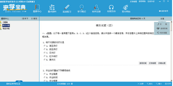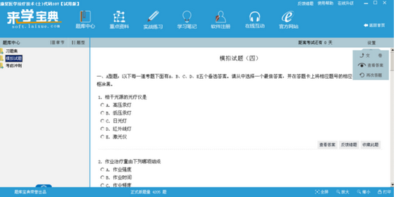 答:来学宝典所有科目均可试用,您可以在我们官网下载试用我们的软件,可以显示5%的试题数量,可以供您试用,同时在界面的最下方显示试题的数量。