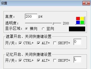 在设置界面(在任务栏右键点击图标,弹出菜单中选择“设置”)可以设置遮罩挡板的透明度和高度,也可以定义开启和关闭挡板的快捷键,还有记忆遮挡区域的快捷键。重新设置这些参数后,请重新启动这个程序设置才会生效。