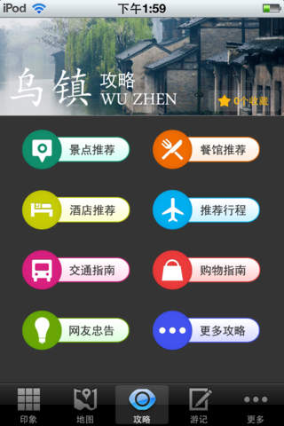 乌镇是一款包含了旅游内所有方面的攻略,比如住宿、美食、购物、交通等等。还能够给你提供导航信息,让你不用担心找不到。去乌镇必选乌镇旅游攻略app!想去乌镇旅游的朋友快来吧!