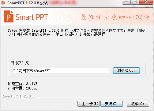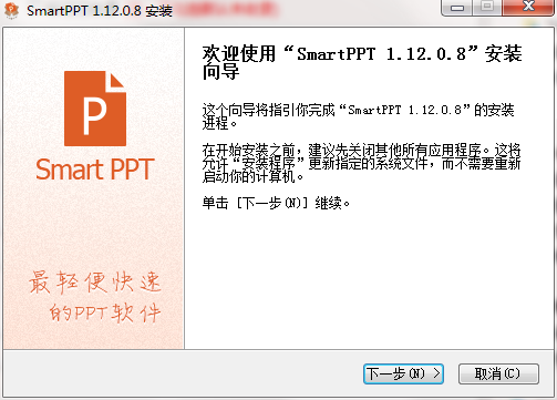 1、在PC下载网将SmartPPT工具下载下来,并到当前文件夹中,点击其中的SmartPPT_1.12.0.8.exe应用程序,进入安装向导界面,接着点击下一步。
