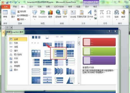 答:首先创建一个能插入图片的SmartArt图形。在下面的文档中,我们选择了一个“垂直图片列表”的图形,该SmartArt图形就可以插入图片
