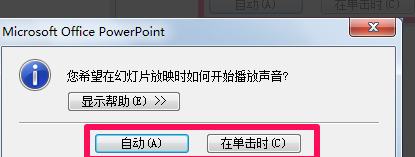 3.在弹出的窗口中根据需要选择,在放映ppt时自动播放音乐还是单击鼠标之后播放音乐。根据需要进行选择就可以了。