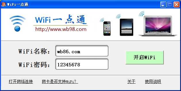 wifi一点通是一个电脑本软件,通过创建一个无线wifi热点,从而让你的台式电脑或笔记本变成一个无线路由器,开启软件后,检测你的网卡是否支持wifi,如果支持的话,输入wifi名称和密码,就可以让你的其它电脑或平板电脑或手机利用创建的WiFi热点免费上网,以后再也不用担心你的手机流量不够用了。