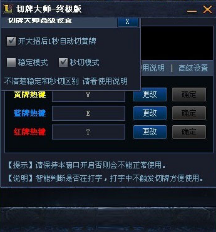 W=黄牌,E=蓝牌,T=红牌,按下键就能自动选牌。按键可以自己随意改