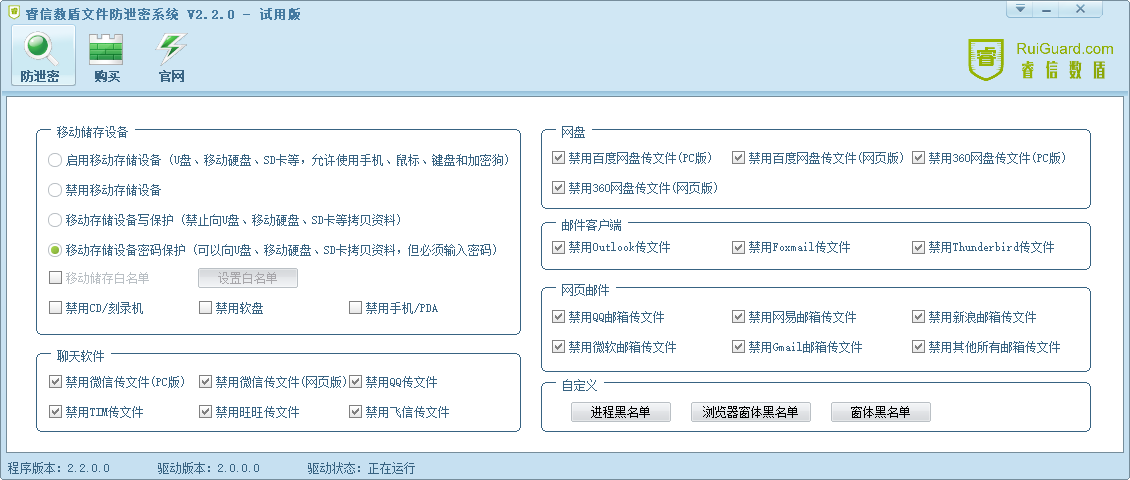 驱动级技术,全面保护文件外发途径(移动存储、聊天软件、邮件客户端、网页邮件、网盘等)