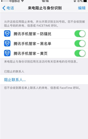打开“设置—电话—来电阻止与身份识别” ,开启相应的号码包(如“腾讯手机管家—防骚扰”、“腾讯手机管家—黑名单”、“腾讯手机管家—黄页”),允许“腾讯手机管家”识别并阻止主叫号码,即可拥有号码识别与举报、号码查询、号码库更新等全面的骚扰拦截服务。
