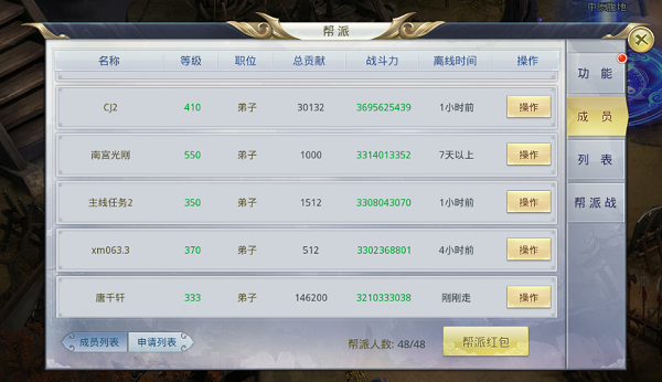 申请列表——显示当前申请入帮的玩家列表,如果勾选“自动批准入帮”,则无需批准,玩家点击申请即可进入帮派