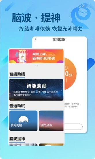 e睡眠app独立使用可实现普通助眠和提神醒脑的八大功能,无需外设,即开即用: